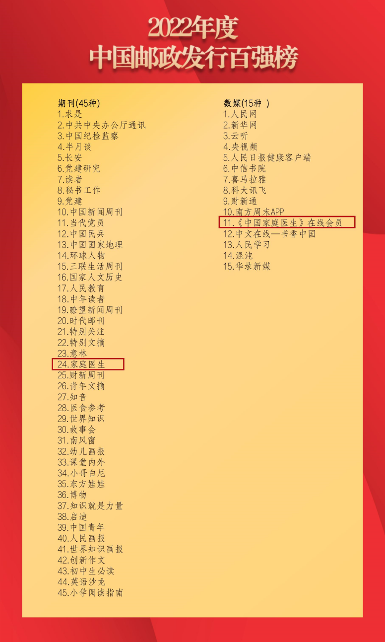 “中国邮政发行百强榜”由中国邮政集团公司根据邮发报刊的发行量、品牌影响力、媒体融合发展贡献度等指标综合选出,真实反映报刊在国内发行市场上的影响力。自1983年创刊以来,《家庭医生》期刊始终以专业严谨的态度、通俗易懂的语言传播健康科普知识,背靠全国三甲医院专家资源,深度探讨百姓最关注的健康话题,为读者深度解读医疗健康热点问题,兼顾科学性、专业性、权威性、可读性,受各界广泛好评,已多次入选全国“百强报刊”。