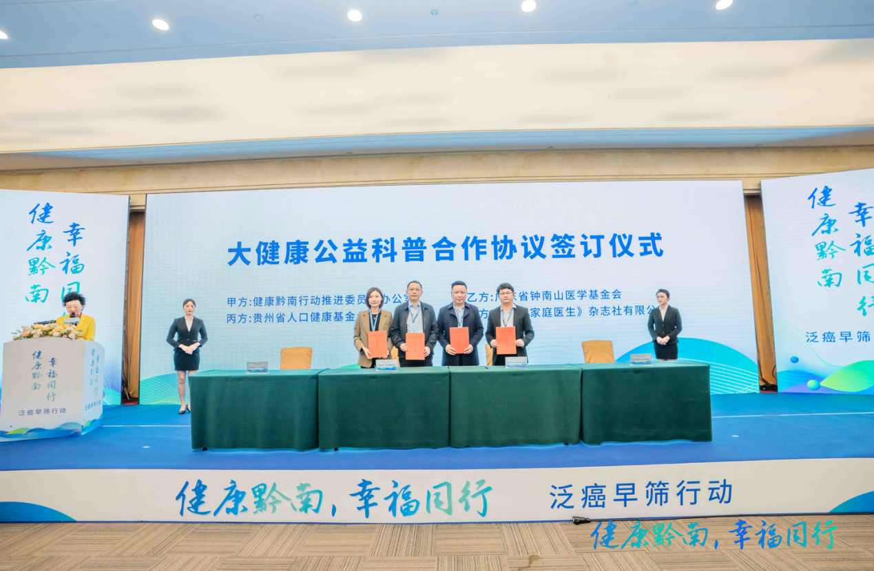 启动仪式上,为积极响应《“健康中国 2030”规划纲要》的核心精神,践行健康知识普及行动,家医杂志社作为企业代表和健康黔南行动推进委员会办公室、广东省钟南山医学基金会、贵州省人口健康基金会签订了大健康公益合作四方协议,政企联手,打造健康黔南。