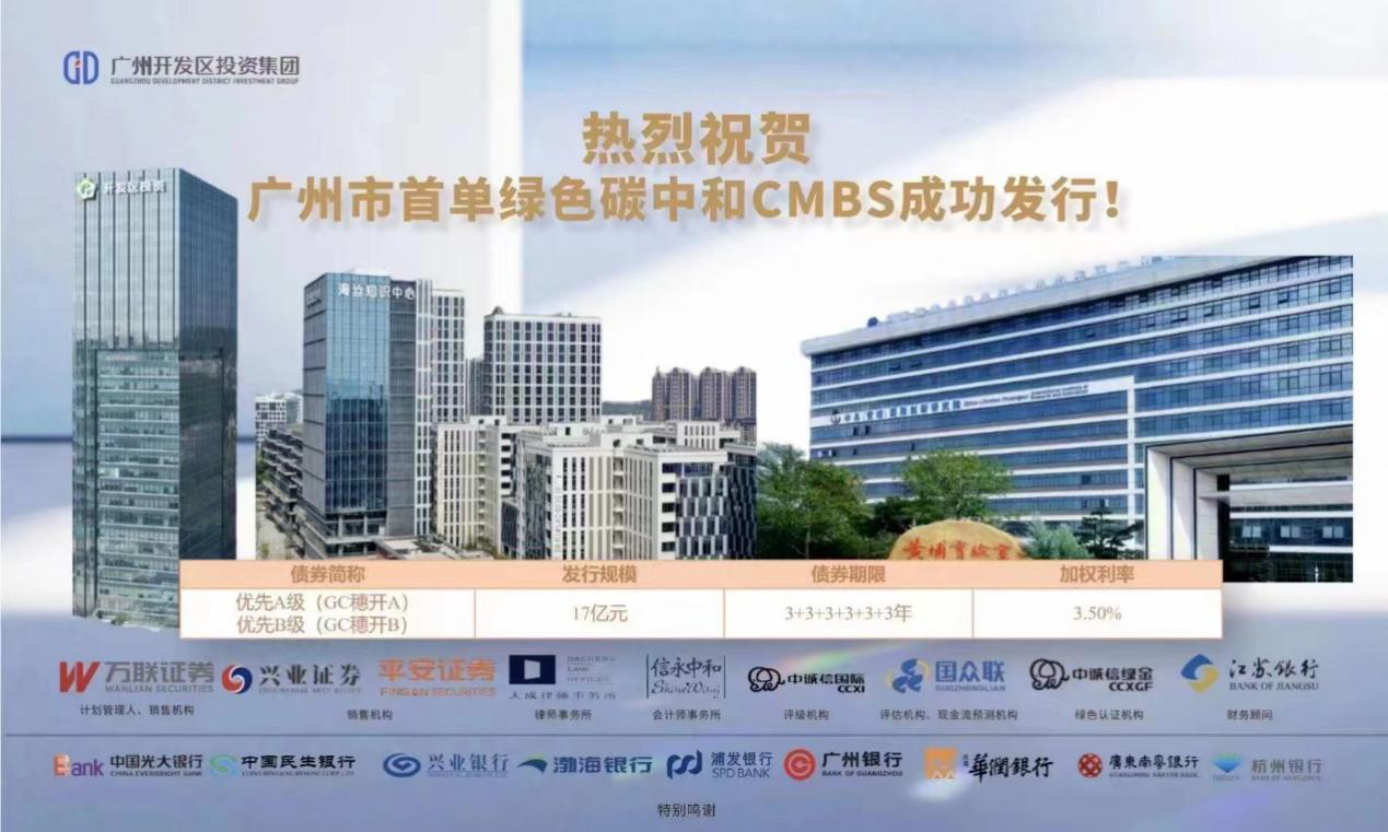 近日,广州金控集团旗下万联证券主承销并担任计划管理人的“万联-广州开发区投资集团2023年绿色资产支持专项计划(碳中和)”在上海证券交易所成功设立。项目总规模17.01亿元,其中优先级17亿元,期限18(3+3+3+3+3+3)年,加权利率3.50%,按季付息;次级0.01亿元,原始权益人自持。该项目是广州市首单绿色碳中和CMBS,获得投资者高度认可,全场认购倍数达1.89倍。