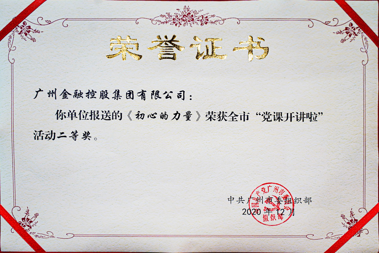 12月28日,由市委组织部举办的“党课开讲啦”暨广州市第十一届全市党员教育电视片观摩交流活动分享会在市广播电视台演播厅举行,广州金控报送的微党课作品《初心的力量》荣获二等奖。