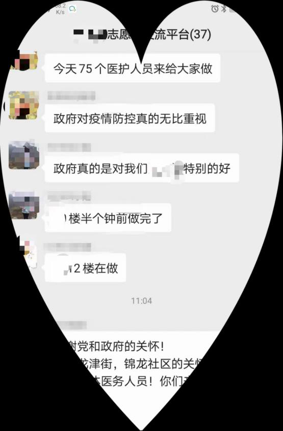 业主自发组织了32人的志愿者团队作为居委和800多位居民的沟通桥梁。面对居民猫要帮忙投喂、慢病开药、要熟食、不要鸡肉、要鸡肉、幼儿园报名、毕业班考试、探热针坏了、抑郁症发病等等五花八门的个人诉求……志愿者们在线上收集问题,梳理归类后反馈给居委落实解决。并协助居委开展核酸检测,派送食材,收垃圾,发快递,测体温,户数人数核查等等。小区秩序从一开始的混乱到逐渐的有序;居民从一开始的恐慌到后来的安心配合,加强管控方式时爆发的问题得到很快的解决。通过志愿者们和居委齐心协力汇鑫阁第十四天的核酸检测顺利广完成,结果全部为阴性,邻里们很幽默乐观地戏称汇鑫阁为“汇阴阁”、很温暖包容地期待郭婆转阴健康归来成为“全阴阁”。