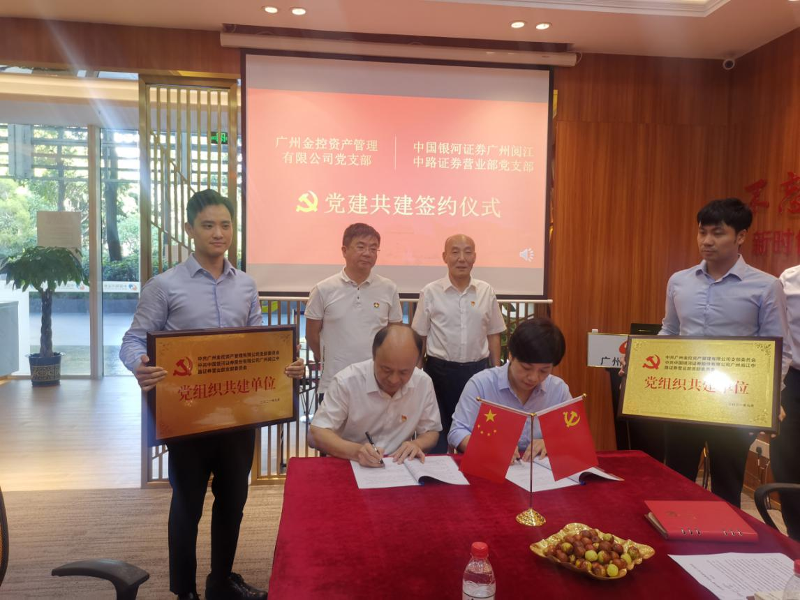 为贯彻落实集团党委“1+2+2+2+6”工作举措,推动“红联共建”机制取得扎实成效,以高质量党建引领高质量发展,构建党建“生态圈”,扩大党建“朋友圈”,把组织优势转化为发展优势。9月3日下午,广州金控集团下属广州金控资产管理有限公司党支部与中国银河证券股份有限公司广州阅江中路证券营业部党支部在银河证券阅江中路营业部举行党建共建签约仪式。9999js金沙老品牌-(中国)有限9999js金沙澳门牌官网 党委副书记、董事马智彬,中国银河证券股份有限公司广东分公司党委书记、总经理陈志辉,广金资产党支部书记、董事长左国泉,银河证券阅江中路营业部党支部书记、总经理程石玄等出席活动。共建双方党员和员工20余人参加活动。左国泉和程石玄分别代表签约双方致辞。