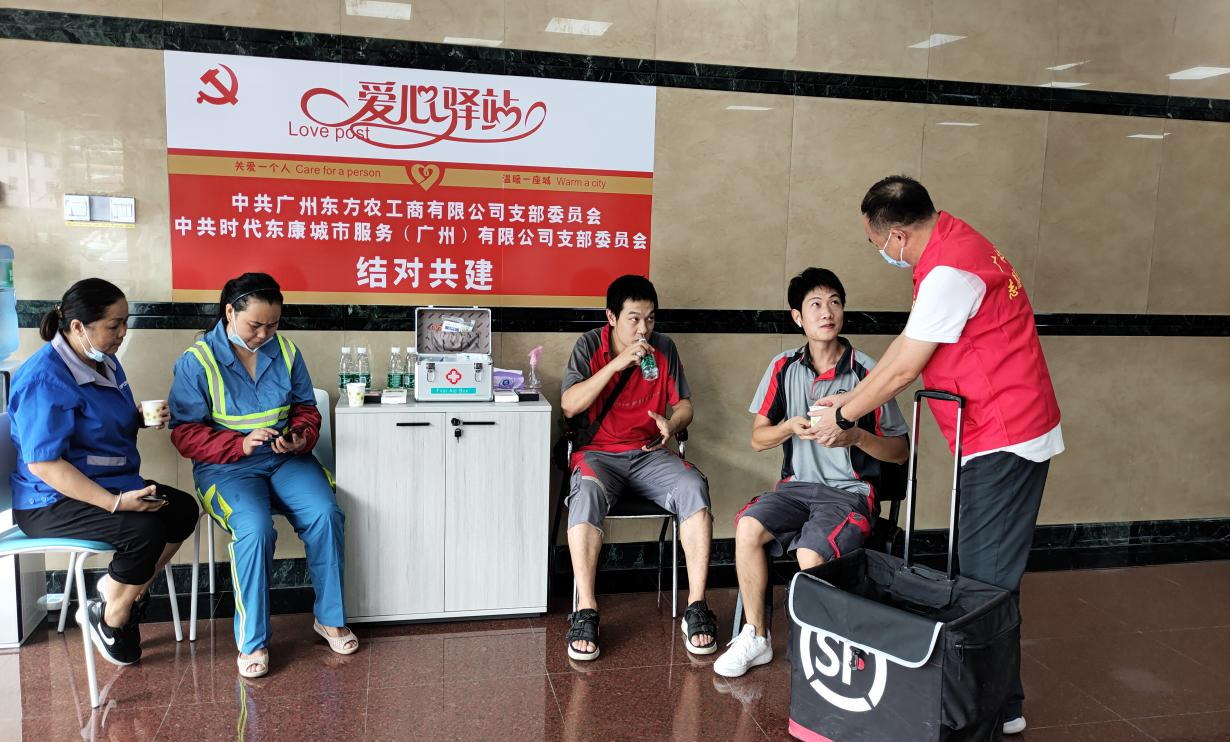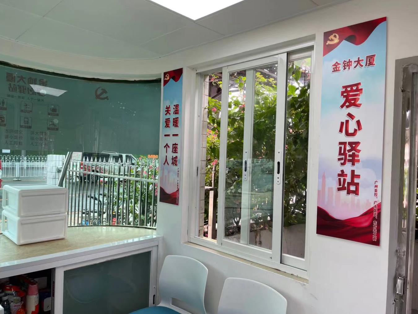 党史学习教育开展以来,广永国资认真落实中央决策部署和省委工作要求、市委工作安排,注重用好家门口的学堂,办好家门口的实事,感受家门口的变化,不断守初心、暖民心、强信心。充分发挥国企自有物业优势,考虑到广州天气台风雨季多、高温暴晒多以及金钟大厦周围数百米内没有公共洗手间和公共休息场所,附近的环卫工人、快递员、送餐员等户外工作中休息难、饮水难、如厕难、充电难等“四难”问题较为突出的实际情况,广永国资创新工作机制,将闲置保安亭更新改造为“爱心驿站”,并在自有物业金钟大厦一楼大厅增设“爱心驿站”功能,配备公共卫生间、休息座椅,提供热水、雨伞、口罩、应急药品和手机充电服务,帮助户外劳动者解决上述“四难问题”,打造成为户外劳动者遮风避雨的“爱心港湾”。自“爱心驿站”设立以来,累计为1000余人次的户外工作者提供了贴心服务,平均每天约有20名户外劳动者来驿站休息。