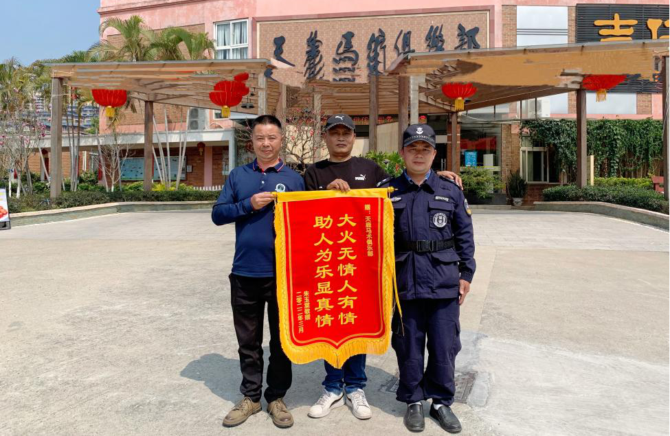 3月2日,广州金控集团下属赛马总公司天麓马术俱乐部(简称俱乐部)收到了附近村民朱先生送来的“大火无情人有情 助人为乐显真情”锦旗。他紧紧握住保安队长候继林的手,激动万分地说:“非常感谢咱们的安保人员,幸亏你们发现得早,救火神速,不然我的房子可能已经化为灰烬,损失将不堪设想!”