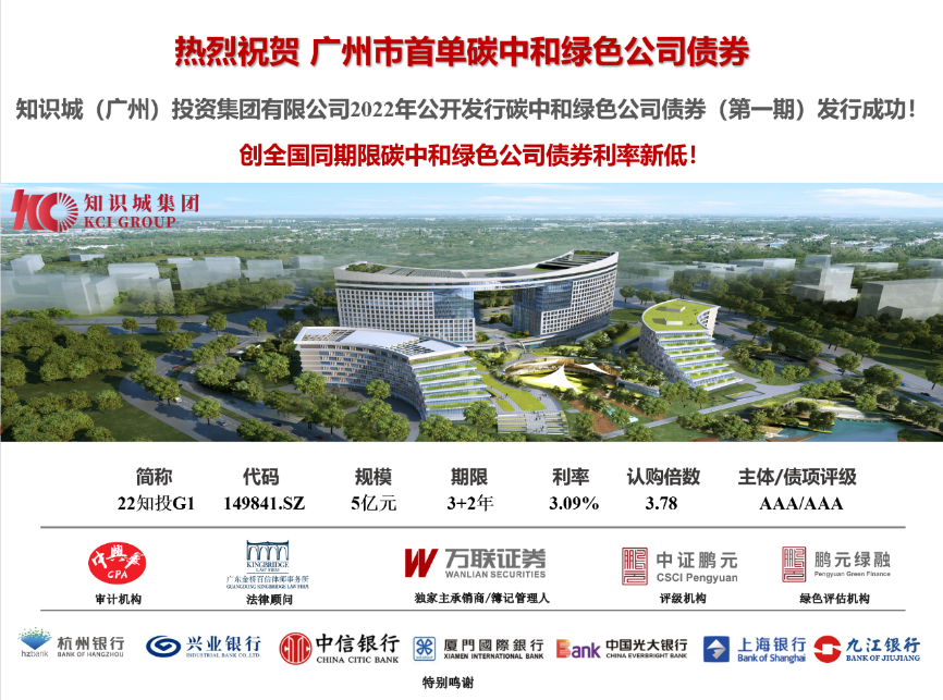 3月11日,广州金控集团下属万联证券独家主承销并担任受托管理人的“知识城(广州)投资集团有限公司2022年面向专业投资者公开发行碳中和绿色公司债券(第一期)”在深圳证券交易所成功发行,规模5亿元,期限3+2年,信用评级AAA,票面利率3.09%,创全国同期限碳中和公司债券利率新低。本期债券是广州市首单碳中和绿色公司债券,获得投资者高度认可,全场认购倍数达3.78倍。