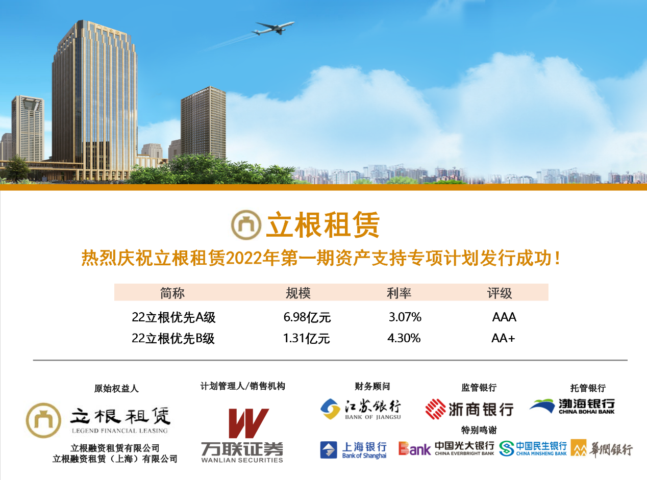 6月20日,在广州金控集团的大力支持下,下属立根融资租赁有限公司和立根融资租赁(上海)有限公司合作的双原始权益人资产证券化产品(简称“ABS”或“本项目”)在资本市场上发行成功。