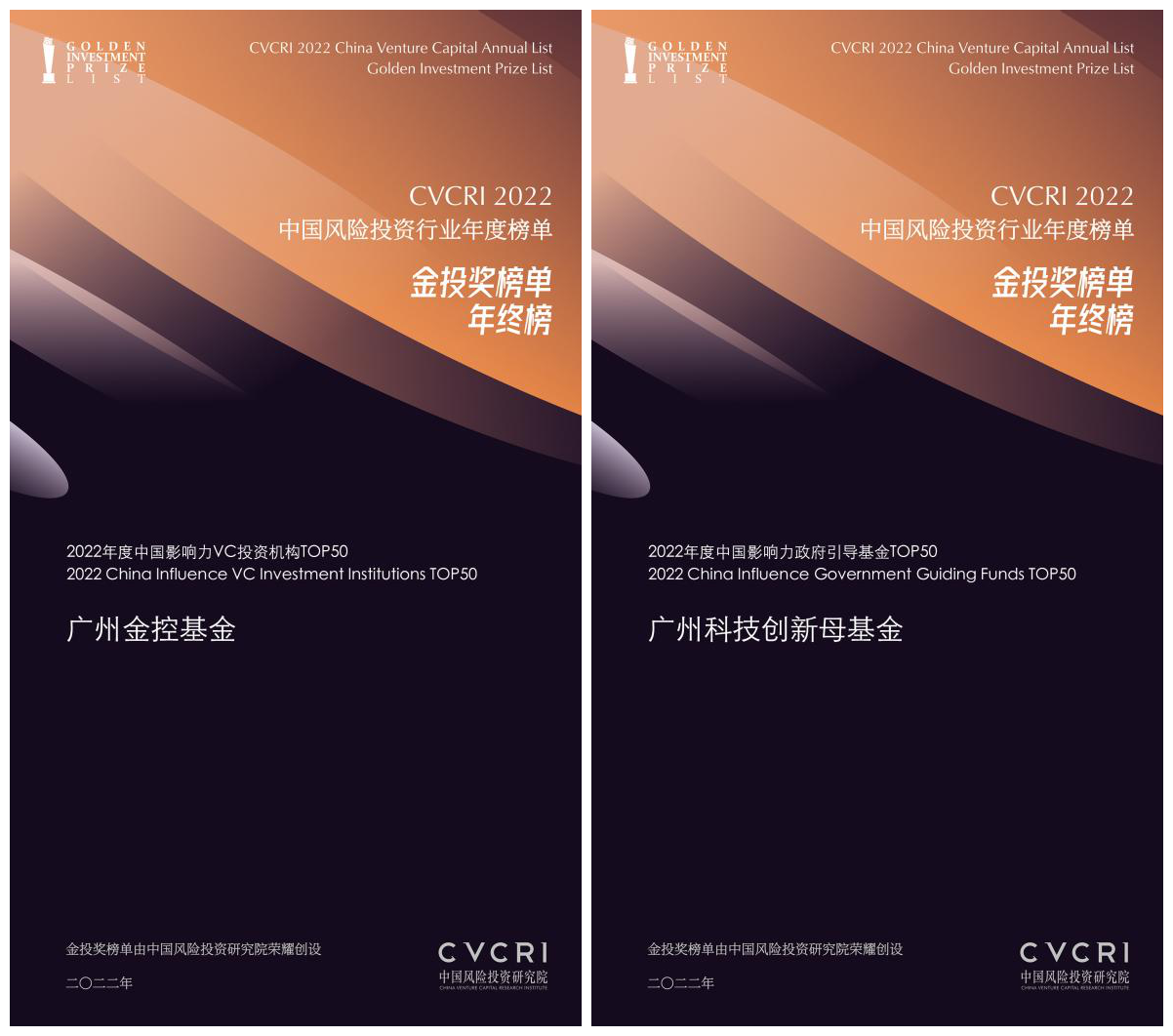 1月10日,CVCRI·2022中国风险投资行业年度榜单•金投奖榜单•年终榜隆重揭晓,广州金控集团旗下广州金控基金荣获“2022年度中国影响力VC投资机构TOP50”,广州金控基金受托管理的广州科技创新母基金荣膺“2022年度中国影响力政府引导基金TOP50”。
