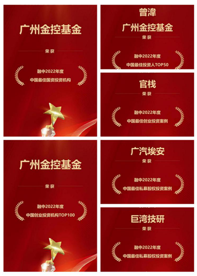 融资中国是国内知名的股权投资与产业投资媒体平台,秉承科学严谨的研究方法和公平公正的排名态度,采用专业、科学、严谨、可量化的方式,从机构的管理规模、募资金额、投资案例数量、综合回报水平等多角度进行分析和筛选,深度结合投资机构、被投企业的市场表现,评选出股权投资机构主榜、综合榜、企业榜等三大类、数十项榜单。广州金控基金凭借专业的投资管理能力和多个优秀投资案例,一举获得“融中2022年度中国最佳国资投资机构”“融中2022年度中国创业投资机构TOP100”奖项,曾湋荣获“融中2022年度中国最佳投资人TOP50”,投资官栈案例荣获“融中2022年度中国最佳创业投资案例”,投资巨湾技研、广汽埃安案例荣获“融中2022年度中国最佳私募股权投资案例”。