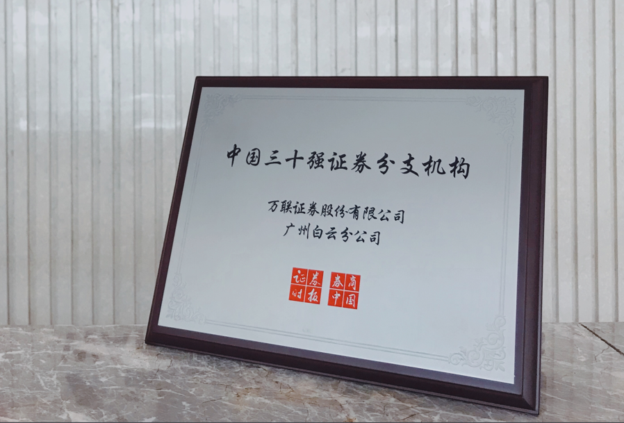 白云分公司秉承万联证券“诚信、务实、团结、高效”的经营理念,深入推进各项业务的开拓创新。近年来,分公司多次获得万联证券“先进集体奖”,连续六年获得万联证券“最佳利润贡献奖”,并凭借优秀的业绩表现和专业的服务水平斩获《证券时报》评选的“中国三十强证券分支机构”称号、“中国证券业三十强证券营业部”称号以及上交所“股票期权百强营业部”、“ETF百强营业部”称号。
