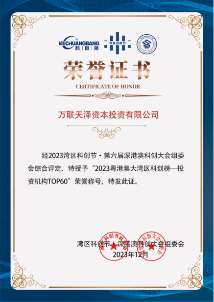 万联天泽资本成功入选2023粤港澳大湾区科创榜投资机构 TOP60,代表主办方对公司在科创领域取得成绩的肯定与表彰。