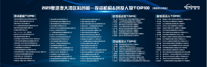 活动由科创榜基金会、深圳市互联网创业创新服务促进会、粤港澳大湾区创新智库主办,香港生产力促进局、香港浸会大学、香港大学创新与创业研究中心支持,深圳市新兴战略产业博士专家联谊会、一百天使母基金、国安特资本联合主办。“科创百强榜”旨在挖掘和表彰湾区的优秀科创企业、投资机构及创投人物,为粤港澳大湾区的科技创新生态树立榜样,迄今为止,该评选活动已经影响了数万家科技企业,有效申报数千家。投资机构 TOP60榜单的评选本着公平公正原则,经过严格第三方平台数据比对及资深专家审议,除了考虑行业、营收、团队等基本条件外,还注重机构的资金管理规模、项目投资数量、重要成功案例等方面的条件。
