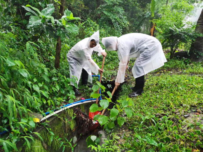 喻志平与项目经理冒雨清理林区排水渠