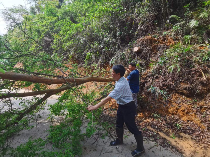 雨后喻志平与项目经理清理倾倒的树干畅通道路通行