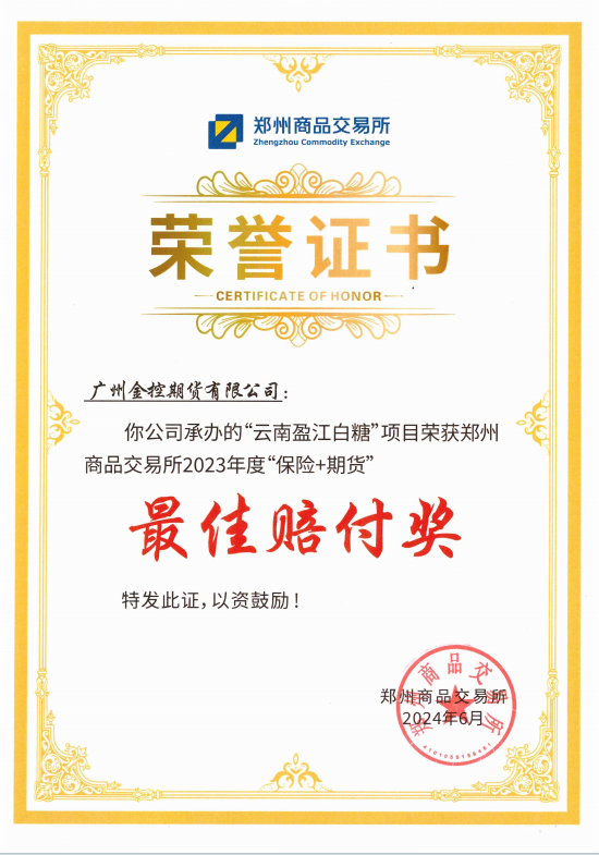 近日,广州金控集团旗下广金期货参与承办的2023年郑州商品交易所盈江县白糖“保险+期货”县域覆盖项目荣获郑商所“最佳赔付奖”。该项目涉及盈江县11个乡镇、1个农场社区,投保甘蔗面积62680亩,对应现货白糖量39175吨,共赔付保险2145.89万元,赔付率236.85%。