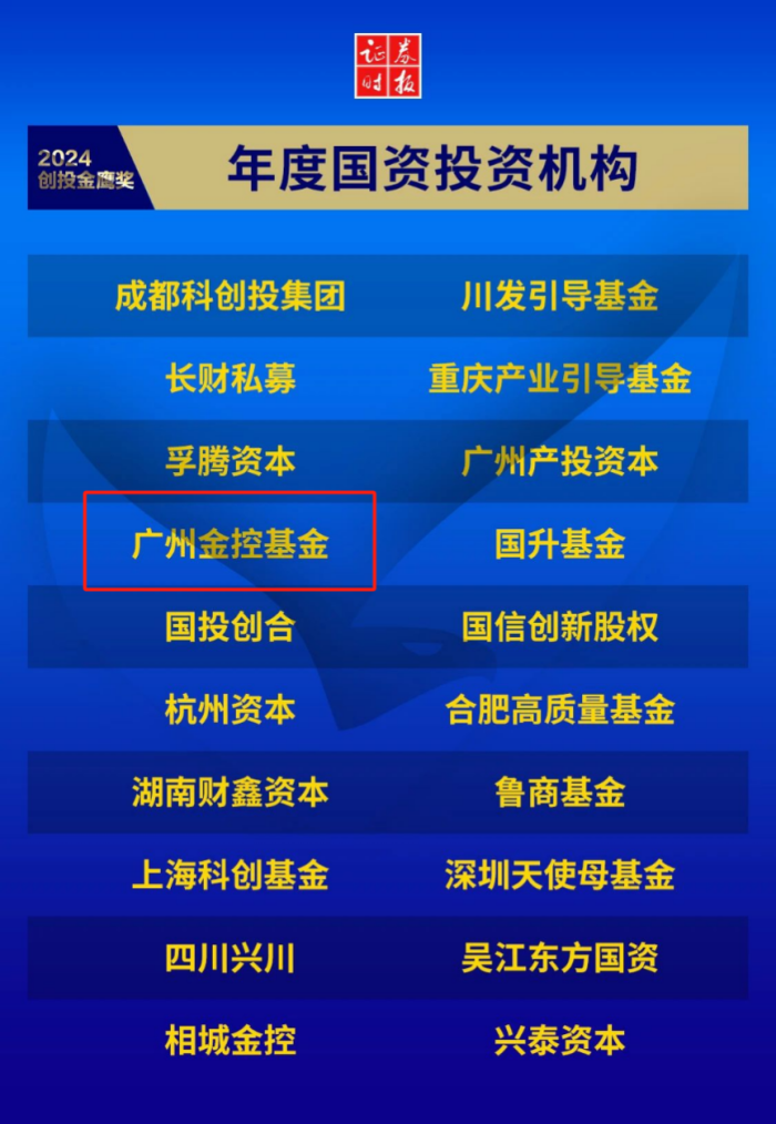 近日,由证券时报社主办的“寻找创投‘金鹰’发现企业‘新苗’计划”评定结果正式出炉,广州金控基金荣登“2024年度国资投资机构”榜单。