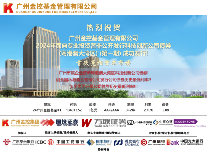 2024年8月23日,广州金控集团旗下广州金控基金管理有限公司2024年面向专业投资者非公开发行科技创新公司债券(粤港澳大湾区)(第一期)在深圳证券交易所成功发行。本期债券发行规模3亿元,期限3+2年,票面利率2.10%,全场认购倍数达5.08倍,是广州市属企业首单粤港澳大湾区科技创新公司债券,发行利率创全国同评级公司债券历史最低利率(主体AA+/债项AAA)、全国私募基金管理公司发行公司债券历史最低利率。