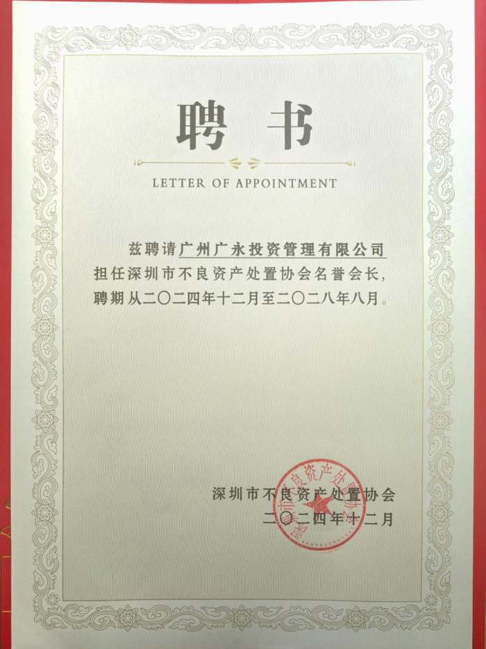 此次获聘深圳市不良资产处置协会名誉会长,是对广永投资的肯定与鞭策。未来,广永投资将积极参与协会的各项活动,为协会的健康发展建言献策。同时,广永投资也将借助协会的平台,进一步加强与业内企业的交流与合作,以更加敬业的精神、更加专业的能力、更加高效的服务回馈协会会员单位和业内合作伙伴的信任,共同推动不良资产处置行业的繁荣发展。