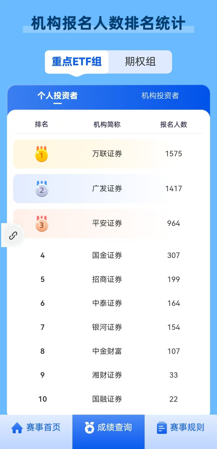在国务院“新国九条”政策引领下,资本市场高质量发展迈入新阶段。广州金控集团旗下万联证券积极响应政策号召,全力支持参与深交所第二届“博衍杯”ETF及期权实盘交易大赛,以专业实力助力投资者把握市场机遇。截至目前,万联证券重点ETF组报名人数暂列行业第一,个人与机构投资者参与热情持续高涨,共同为资本市场稳健发展注入动能。