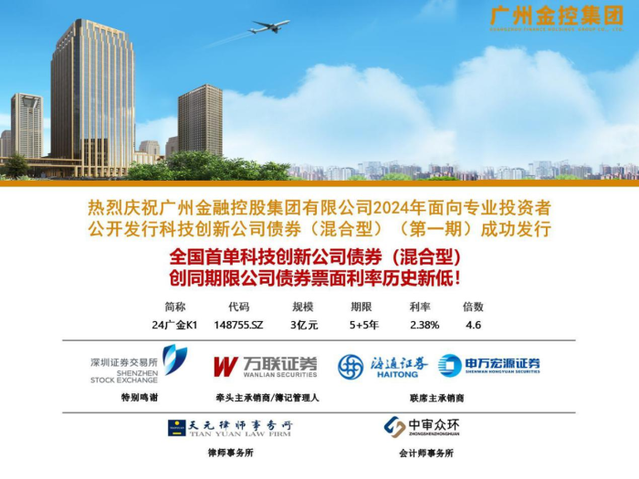 案例简介:2024年6月,万联证券作为牵头主承销商及簿记管理人,助力广州金控集团成功发行2024年面向专业投资者公开发行科技创新公司债券(混合型)(第一期)(以下简称“本期债券”)。本期债券是全国首单科技创新公司债券(混合型),发行规模3亿元,票面利率2.38%,全场认购倍数达4.6倍,发行利率创同期限公司债券票面利率历史新低,募集资金用于广州金控基金管理的广州科技创新母基金出资。本期债券创新设置了后5个计息年度的票面利率与基金年化现金分配收益率的挂钩条款,使得债券票面利率在后5个计息年度具有上浮空间,债券投资者有机会享有基金投资收益带来的债券票面利率上浮收益,吸引了大量市场化投资者,体现了投资者对科创领域资金用途、债券创新条款的认可,更是对广州市政府引导基金及“耐心资本”助力风投创投产投发展的信心体现。